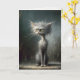 A scruffy long-haired cat with striking green eyes sits with an inquisitive expression against a mysterious cityscape backdrop for a birthday.
