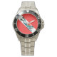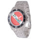 Has heft and feel of expensive stainless steel quartz watches. Good band with safety catch. I removed links, which is easy because engraved arrows show direction to push the linking pins. As always by this seller, the image (a railroad logo) is a perfect reproduction of my emailed image, and is precisely spaced and aligned.