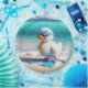 A fluffy white duckling stands on a sandy beach, wearing blue flippers and diving goggles