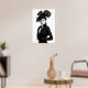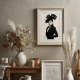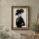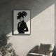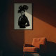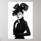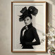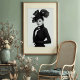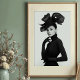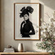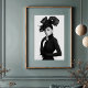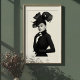 Make a striking statement with this captivating black and white art print, a true masterpiece of avant-garde fashion and artistic expression. This compelling frontal portrait features a woman of intense allure, crowned with an extraordinary, voluminous black hat crafted from what appears to be sheer, ruffled fabric, creating a dramatic and abstract silhouette. Dressed in a sleek black turtleneck with elegant drapes and long gloves, her minimalist attire is accented by shimmering stud earrings. Her pale skin, stark black lips, and piercing gaze with dramatic winged eyeliner create a mesmerising contrast against her dark ensemble and the pristine white background, emphasizing her powerful and direct presence. With a confident and enigmatic expression, this artwork embodies a fierce, mysterious, and undeniably chic elegance. Perfect for modern living spaces, fashion studios, or any decor seeking a touch of unique sophistication, bold artistry, and a truly unforgettable visual narrative.