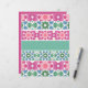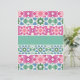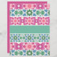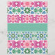 A series of colourful geometric patterns form a symmetrical design, reminiscent of traditional tile work. Each strip features a dominant colour such as pink, blue, or green with watercolor textures, creating a visually harmonious composition.