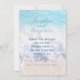 Understated, sea-themed, wedding save the date cards. Customise with your wording in three places over a tropical beach and ocean background. Waves are coming ashore in this image. The colours are light blue (water at the top), white sea foam in the middle, and light tan, smooth sand at the bottom. The back of the card is solid light blue and the text is dark blue in script and printed fonts.