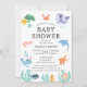 Cute baby shower invitations with a sea animals theme and a gender-neutral design. It includes a fish, dolphin, shrimp, turtle, whale, seahorse, starfish, crab, and more.
