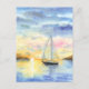 Sea at sunset. A cute yacht leaves the bay and goes to sea. The watercolor illustration was drawn and scanned. Watercolor Landscape made in the open air in 2024.