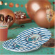 Bright blue and white horizontal pattern design paper plates features a nautical theme with sea captain, silver anchor, and ship wheel!