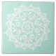 This white mandala sits on a light blue-green background. The colours are serene and creative. Part of the Brosya Mandala Collection.