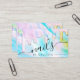 This girly and glamourous nail artist/nail tech business card is perfect for a stylish and trendy professional businesswoman. It features faux printed sparkly mermaid and sea green colour thick glitter drips on top of aqua, blue, and sea green holographic iridescent background. The typography is an elegant cursive script with a modern serif font to match. The colour scheme includes aqua, white, blue, yellow, and green It's chic, pretty, unique, and luxurious; the perfect way to advertise your business and stylise your marketing and advertisement material for your customers.