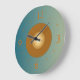 A simplistic round clock in sea green. At the centre is a circle design in light tan ,bronze and lemon . Numerals to match . Available in round and square shapes.Customise to change numerals colours if wished.