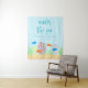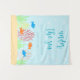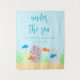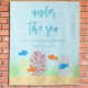 Sea life baby shower with orange and blue fish playing amongst a sandy reef of coral and seaweed, amidst ocean bubbles.