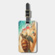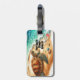 Heading to a warm tropical destination with beach vibes on your mind, this luggage tag boasts a sea turtle basking on the caramel sand, two red sea crabs watching him with the turquoise ocean rolling inland with gentle frothy waves, reminiscent of beach days. Customise with information as desired.