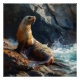A digital illustration of a sea lion basking lazily on the rocky shore.