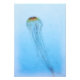 A watercolor painting of a jellyfish, with a colourful top, in the big, open, blue ocean.