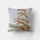 In a relaxed and beautiful coastal mood, the original photograph by MaeFlowers on this 16” Throw Pillow is a closeup of golden coloured sea oats bending in a sea breeze. In the background is the ocean, in soft focus shades of pale grey blues and greens. A small wave approaches the muted brownish grey beach.