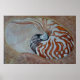 An original egg tempura art work by Aileen Rolfe in brown, orange, white and black of a nautilus shell lying on its side with the distinct zebra stripe markings visible.