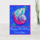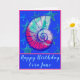 A pretty Nautilus spiral sea shell sits in front of a beautiful ocean royal blue background. Bright turquoise starfish float within the rich blue. The sea shell is light rose pink, fuchsia, turquoise, and midnight Navy blue. The greeting inside the card reads: May your years ahead be filled with happy days. Happy Birthday! The recipient's name is under the seashell on the front of the card. Blue starfish are inside and on the back of the card. The back also has a template for the month and year.