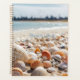 Let your mind drift as you think about the beach and collecting sea shells. Many sea shells in the sand along the shoreline. Crisp blue water and a row of tree's on other side of lake.