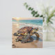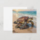 A blank notecard with an illustration of a mama sea turtle and baby crawling into the blue ocean waves on a sandy beach.