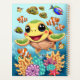 Sea Turtle Cute and Happy Baby Sea Animal Cartoon Character swimming on Summer Underwater, surrounded tropical fishes and Corals vector Illustration Copyright BluedarkArt TheChameleonArt.