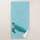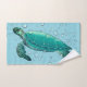 Bathroom towel set with images of sea turtle against a seafoam coloured background with bubbles.