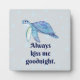 Nursery art tabletop plaque with watercolor sea turtle, faded stars background and "Always kiss me goodnight" in modern text