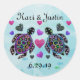 Graphic mosaic illustration of sea turtles and colourful hearts. Customise these stickers with names and date for your special date and share the love.