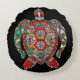 Mosaic sea turtle in jewel tone colours of red, green, blue and gold on a black reversable pillow.