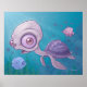 Cartoon illustration of a sea turtle swimming with tropical fish.