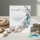 Beach theme wedding reception card features a watercolor seahorse, seashell, starfish and coral with your celebration details such as time and location in dusty blue lettering. Perfect for beach, coastal, nautical, destination and tropical weddings. Art by KL Stock