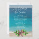Coastal holiday party invitation template. Beach and ocean background with dark blue water. Off-white text has larger script at the top with sample wording, "Let's celebrate the season". All party text is in a paragraph and can be worded for a house party, office party, or other. A brown sea star / starfish with sprigs of green holly, decorates the bottom of 5x7 inch flat cards. Reverse is a solid golden tan image.