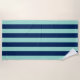 Stylish custom beach towel features bold vertical seafoam green and dark blue stripes.