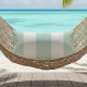 This outdoor lumbar pillow features a pattern of five broad vertical cabana stripes in seafoam green and white.
