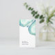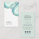 Chic watercolor business cards in a unique vertical format feature your name or company name in the lower left corner, with two geode agate slice illustrations in ethereal seaglass green. Add your full contact information to the back in deep navy blue on a coordinating sea green background. Includes three social media icons and a template field for your username.