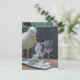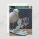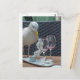 An unusual photograph of a seagull on a restaurant table next to two empty wine glasses printed on a postcard.