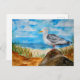 a traditional watercolor landscape artwork featuring a little seagull which is sitting on a rock in front of a sandy and sunny beach.