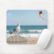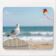 A seagull perched on an Adirondack chair, holding a string of a vibrant kite, while beach waves splash in the background