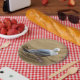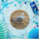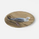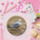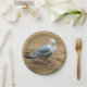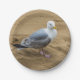 A close up photograph of a seagull on a sandy beach printed on a paper plate.