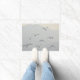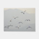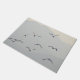 Serene image of seagulls flying highlighted by the sun forming light and shade with misty view of mountains in the distance.