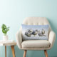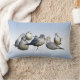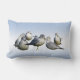 This decorative throw pillow features six grey and white seagulls gathered at the shore on a sunny day. The image is repeated on the back.