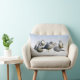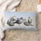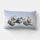 This decorative throw pillow features six grey and white seagulls gathered at the shore on a sunny day. The image is repeated on the back.