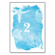 This modern and elegant table number card is ideal to celebrate a wedding with an ocean or beach theme. It features outlined seashells in white on a refreshing blue watercolor background. This design is ideal for a destination wedding, or a wedding at the beach or a Caribbean resort. Add your own wedding details.