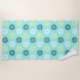 Beach towel with a fun ocean inspired pattern of flowers made up of little seahorses in white, yellow, and dark aqua on a light aqua background.