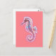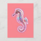 A stylised seahorse with vibrant pink and purple hues stands out against a dark background. It features an intricate design with patterned scales and a curled tail that suggest a whimsical and artistic interpretation.
