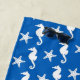 Beach towel in a mixed media digital rendition of a seahorse and starfish against a deep cobalt blue background