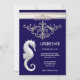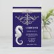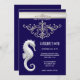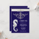 A beautiful plain white seahorse is set against a navy blue background that a faux silver decorative flourish band above it. White text templates appear to the right of the seahorse and are fully customisable. This luxurious and elegant design is ideal for seahorse; beach; coastal and sea or ocean themed birthdays; weddings; anniversaries; retirements and are suited to both business and personal use. Feel free to change the background colour to any colour of your choice to suit your special occasion.
