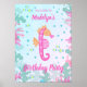 This birthday party poster features a cute seahorse design. Personalise it with a name. This poster is part of a collection featuring other matching birthday party products. Please visit the collection page in our store to see other items.