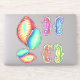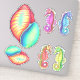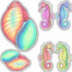 Coloured pencil illustrations of seahorses and seashells in fantastical colours