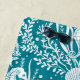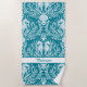 This personalised coastal beach towel features a damask style pattern with seahorses, seaweed, coral and shells, in a teal and white colour scheme.