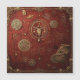 An ornate emblem glows in gold against a textured crimson backdrop, surrounded by arcane symbols and cryptic inscriptions.