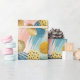 This seamless abstract pattern wrapping paper combines expressive brushstrokes in soft pinks, light blue, and deep navy with playful golden shapes layered on top. Irregular gold blobs—some textured, some smooth and dotted with black polka dots—add bold contrast and a touch of luxury. Scattered dark blue and black dots enhance the composition’s dynamic, artistic energy. Perfect for modern, chic, and creative aesthetics that blend elegance with abstract flair.