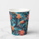 A beautiful set of paper cups with a seamless paper floral pattern against a blue background.